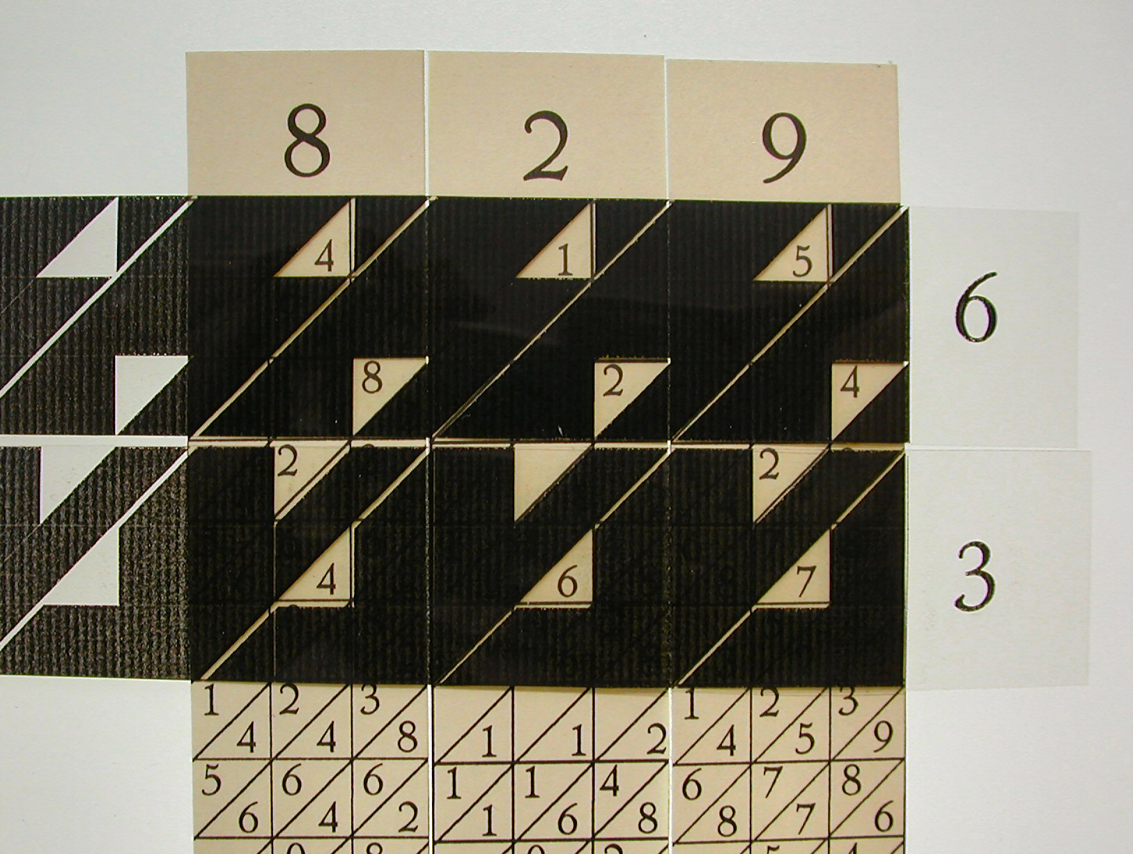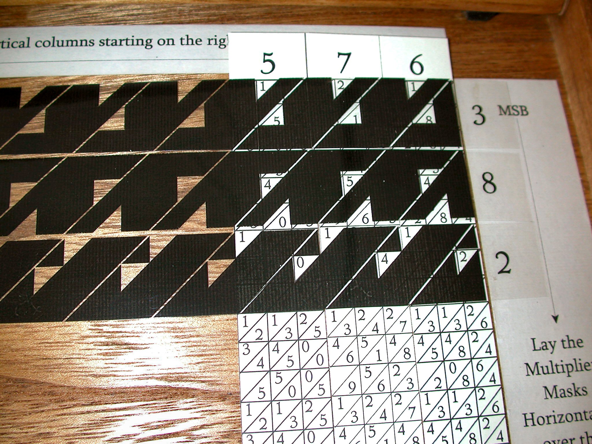 The table slips corresponding to the multiplicand are laid side by side vertical columns, with the most significant digit on the left as usual. The multiplier, designated by the mask slips, is laid horizontally on top of the table slips with the most significant digit in the top row.