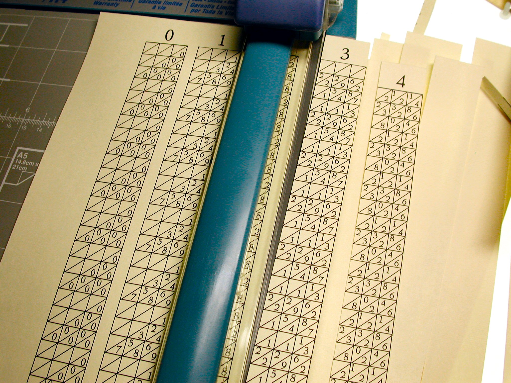 Whether or not this is so, unlike Napier who proposed writing the tables directly onto the slips, I wanted to use a computer to do the layout, and with my failing eyesight, I also wanted the numbers large enough so that I could easily read the results.