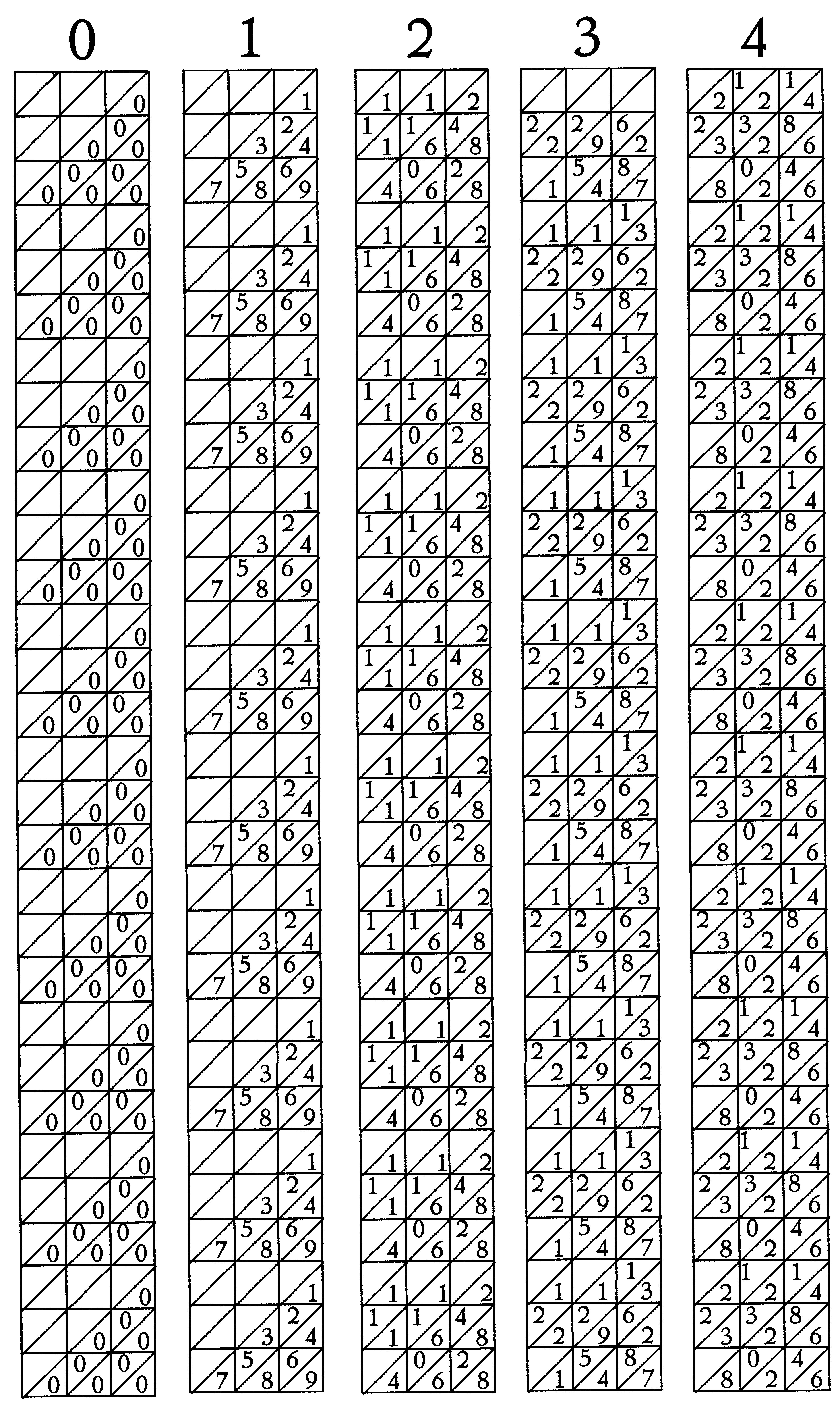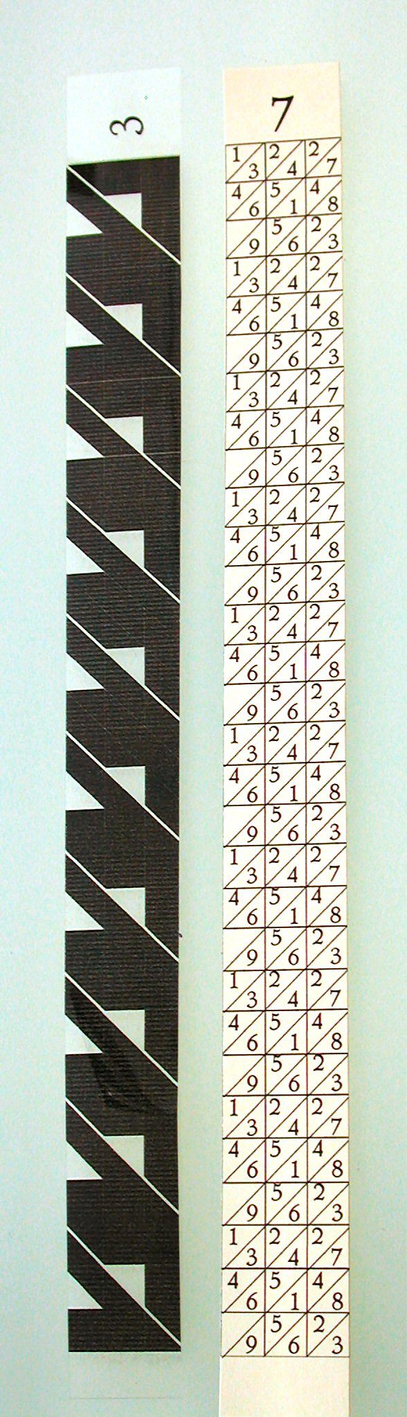 Ever practical, Napier called the slips carrying the tables “vertical slips” since they are placed vertically during calculation. The slips with the masks are placed horizontally over the vertical slips for the solution readout, and these Napier called the “horizontal slips.” I decided to use the terms “table slips” and “mask slips” as being more descriptive of the slip type involved.